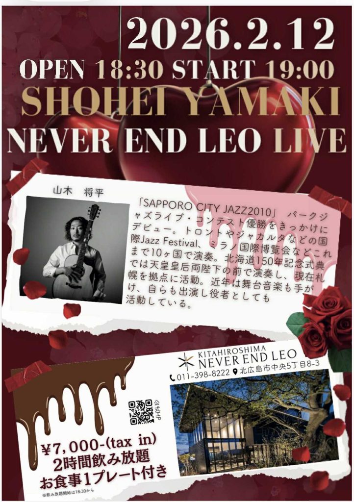 昨年開催して大好評だった北広島・NEVER END LEOでのライブを再び開催することになりました!NEVER END LEOの最高の音響と、リニューアルオープンしたレストランmogの最高のお食事で山木将平ライブをお楽しみ下さい。